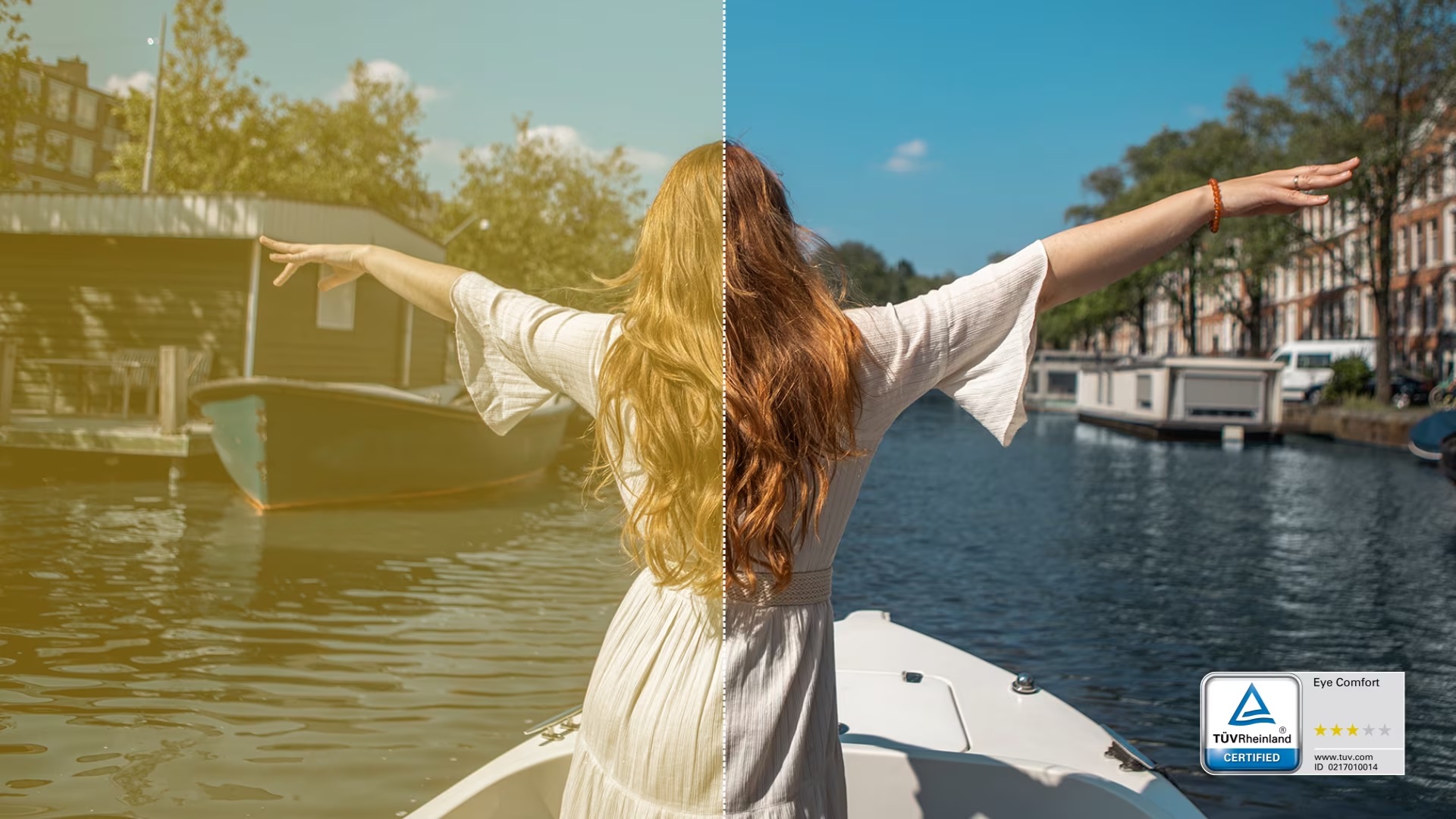 ComfortView Plus, sarı tonları azaltarak daha iyi renk doğruluğu sağlarken, yazılım destekli düşük mavi ışık teknolojisinin sonuçlarıyla karşılaştırıldığında farkı görün.