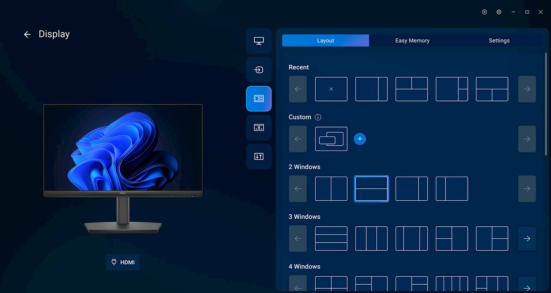 Easy Arrange, ekranlar arasında uygulamaları önceden ayarlanmış bölümlere göre yerleştirir ve beş pencereye kadar özelleştirmenize olanak tanır, çoklu görev yapmayı geliştirir. Easy Arrange Memory, uygulama profillerini elle, programlı olarak veya başlatıldığında kaydeder ve geri yükler.